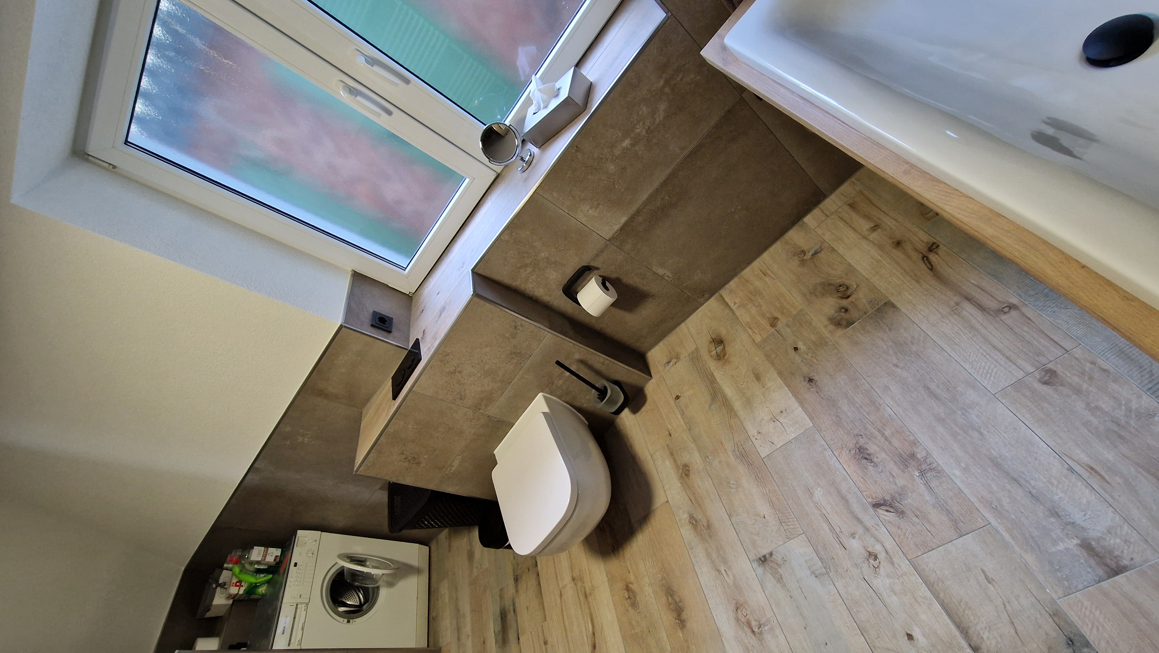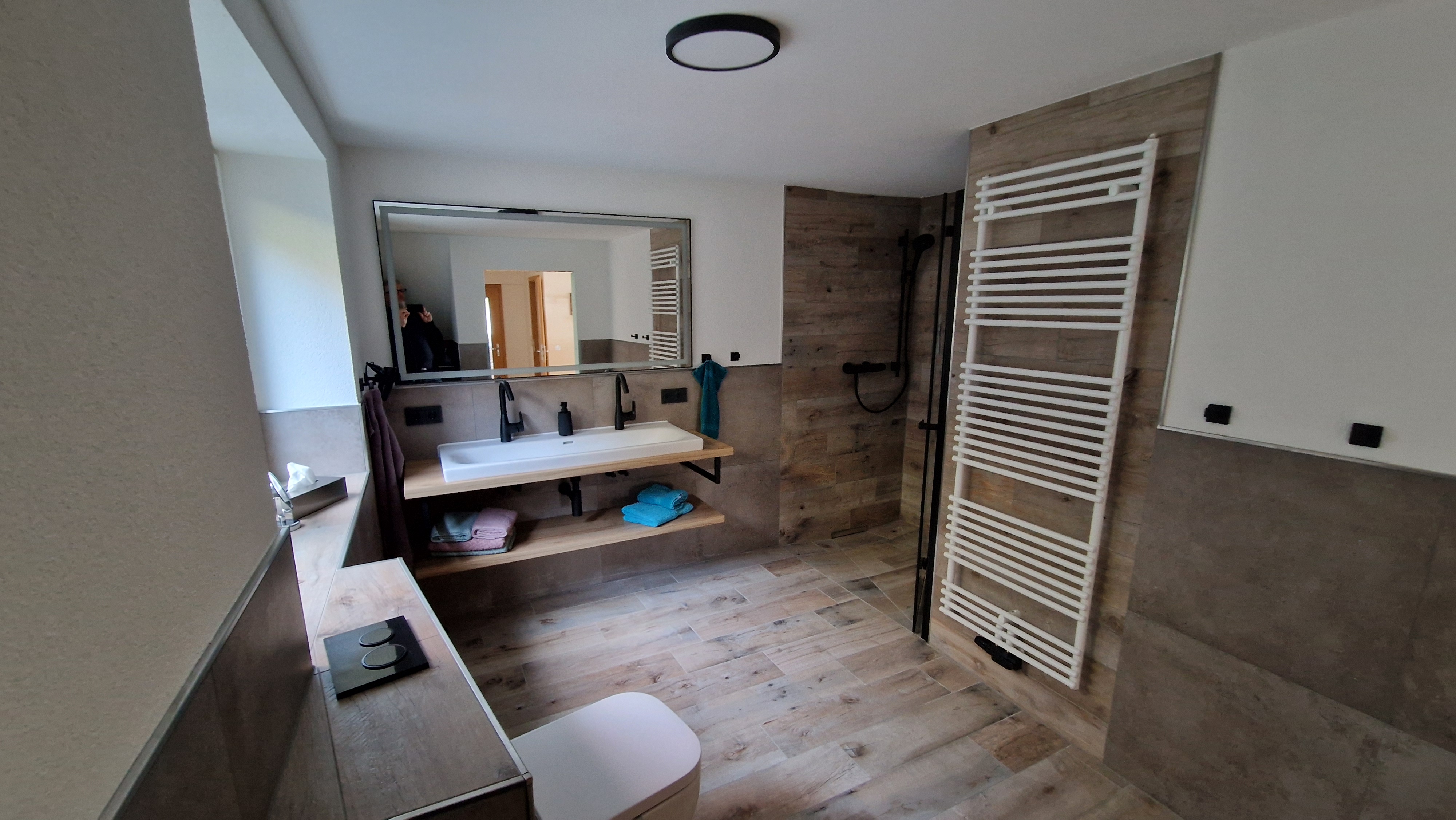 In der großräumigen Dusche erfrischen, oder eben die Wäsche nach der Aktivität waschen ... all das bietet das geräumige Bad im Erdgeschoß.