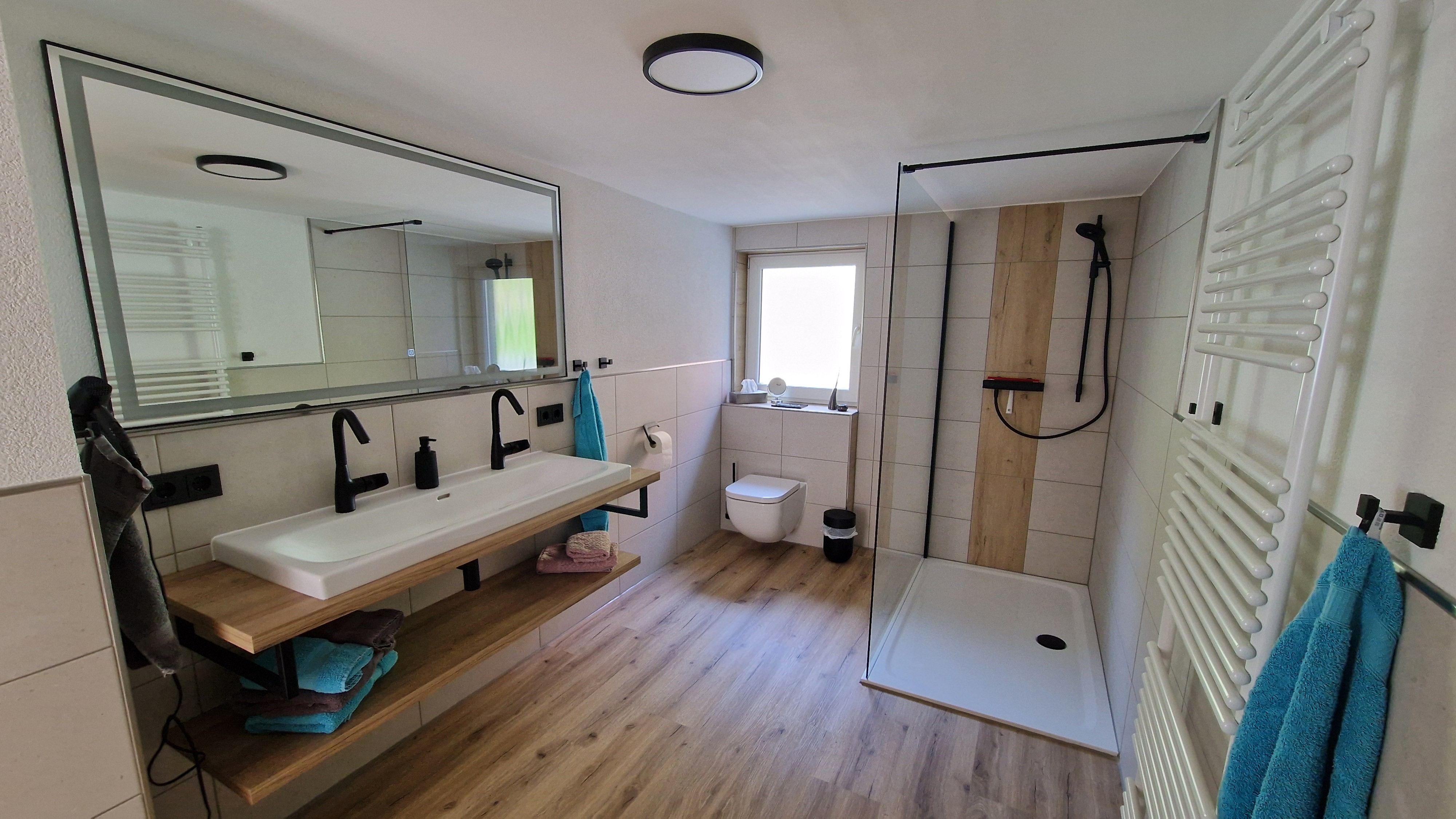 Auch im geräumigem Bad im Obergeschoss steht eine große Dusche zur Verfügung. Es liegt direkt am großen Schlafzimmer und bietet so einen intimen Zugang.